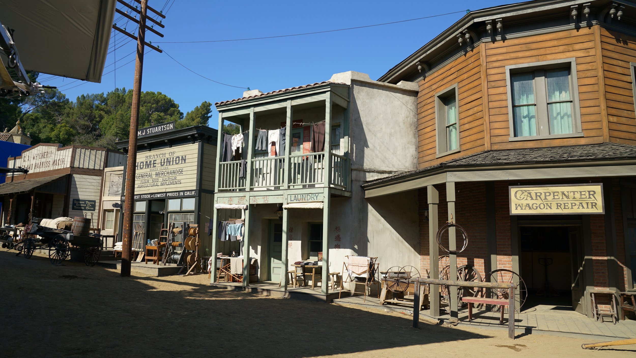 The western town sequence was built on the Universal backlot—one of the few environments created entirely in-camera. I produced the on-set graphics for the storefronts and signage, working with the art director and scenic department to place each element within the existing architecture. Everything was scaled, printed, or painted specifically for how it would read through the lens, giving the town its texture and sense of history.