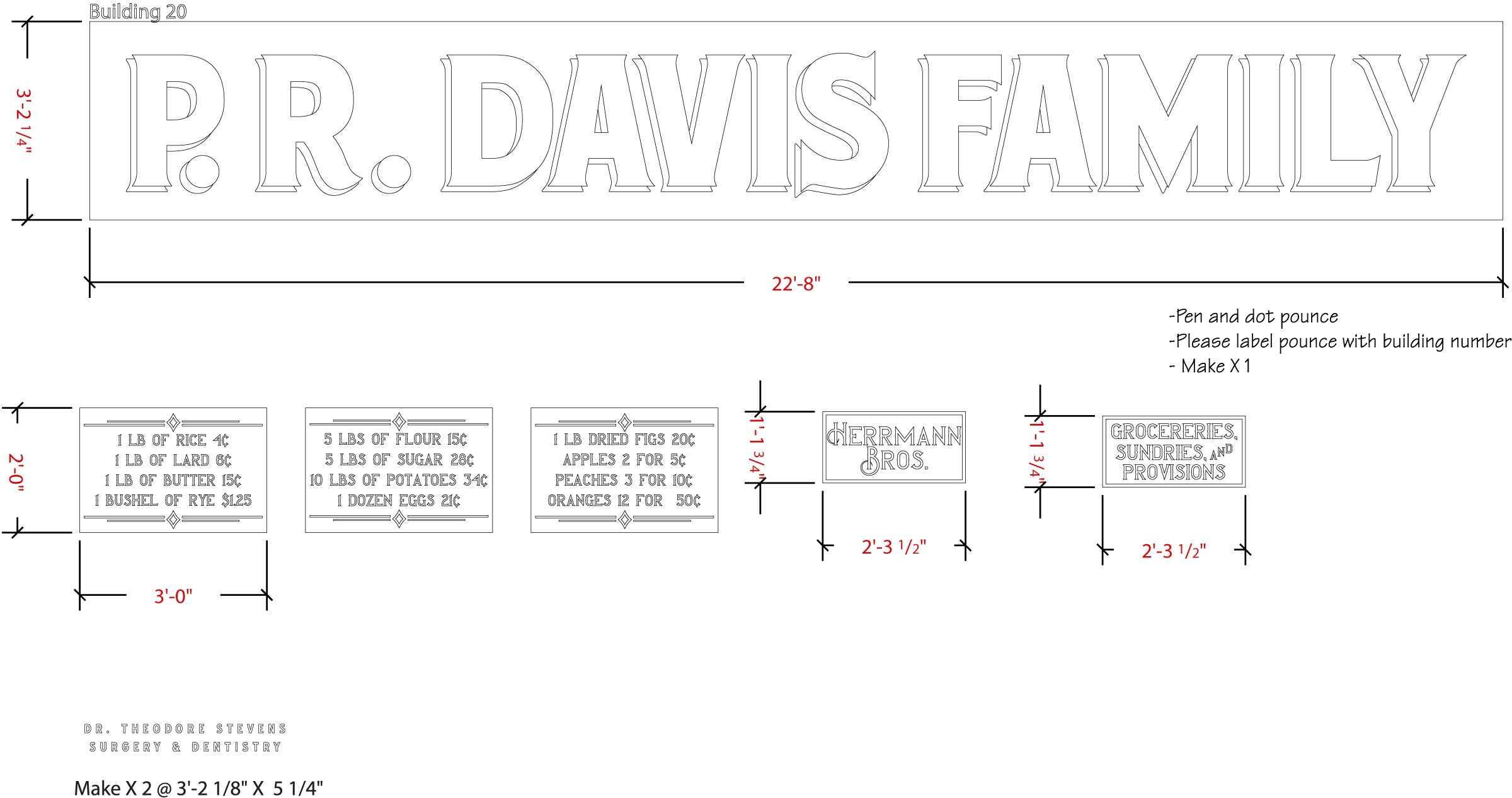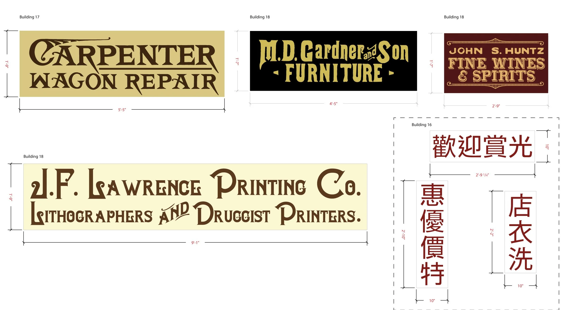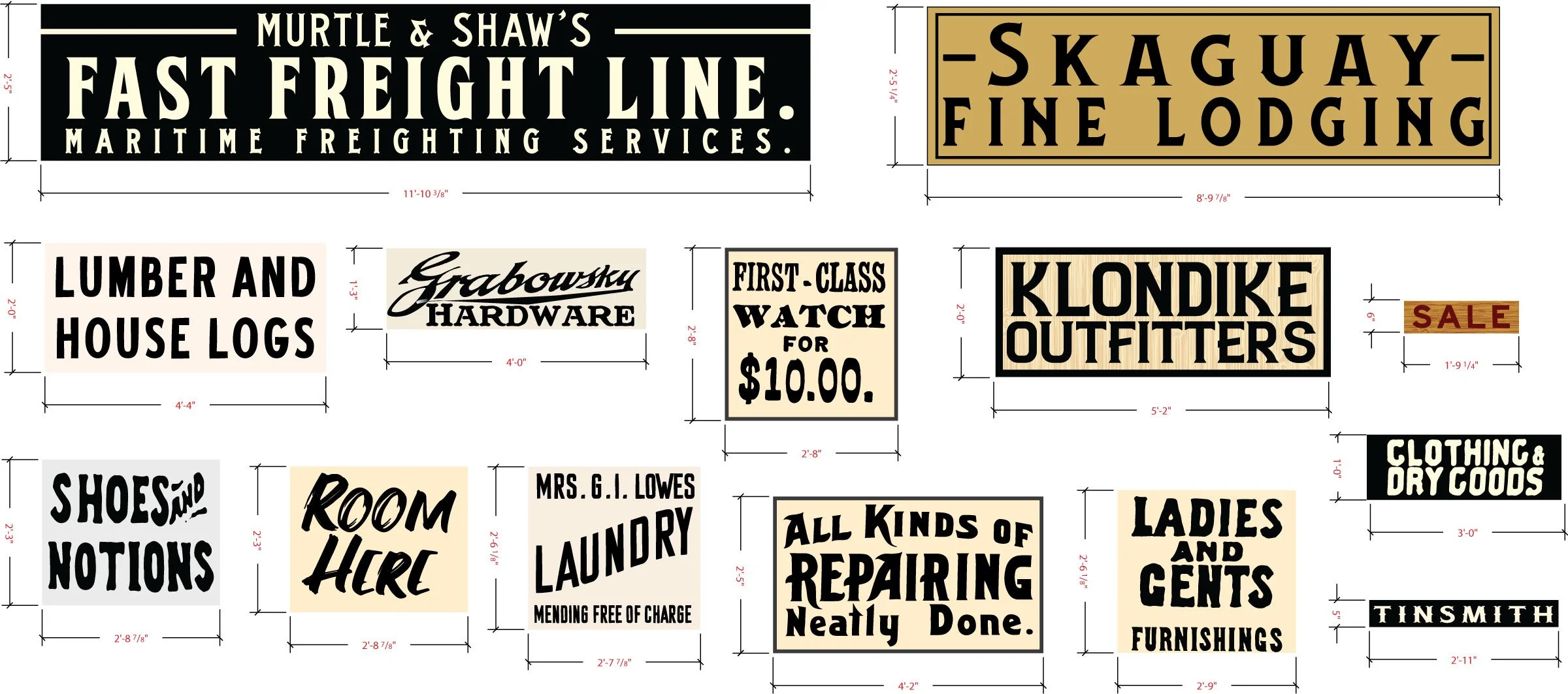 The hand-painted signs in both the Santa Clarita set and the Yukon town were first designed digitally in Adobe Illustrator. After approval, I converted the graphics into files for pounces and chose the paint colors. Working closely with the scenic team, we used the pounces to faithfully bring my digital designs to life on set.